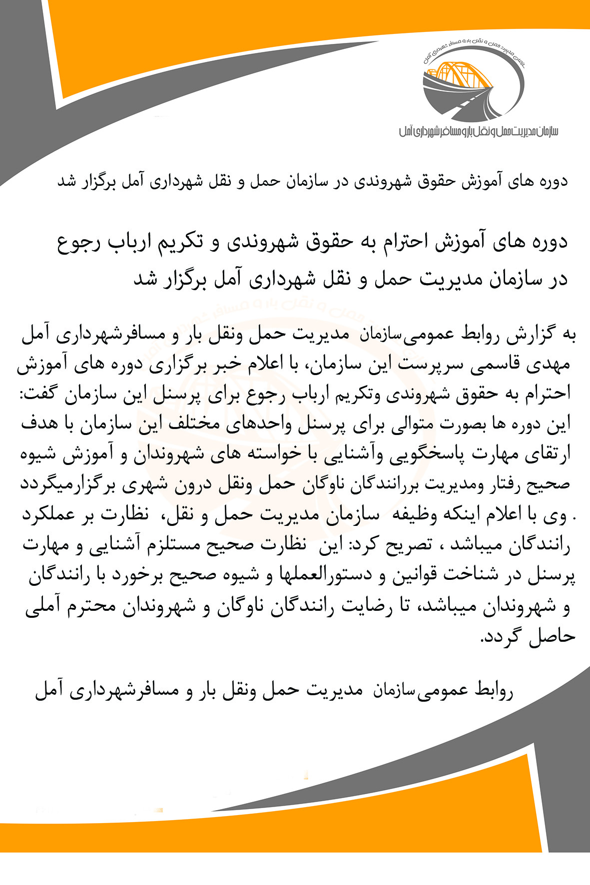 به گزارش روابط عمومی، مهدی قاسمی سرپرست سازمان مدیریت حمل و نقل بار و مسافر شهرداری آمل، با اعلام خبر برگزاری دوره های آموزش احترام به حقوق شهروندی و تکریم ارباب رجوع برای پرسنل این سازمان گفت: این دوره ها بصورت متوالی برای پرسنل واحدهای مختلف این سازمان با هدف ارتقای مهارت پاسخگویی و آشنایی با خواسته های شهروندان و آموزش شیوه صحیح رفتار و مدیریت بر رانندگان ناوگان حمل و نقل درون شهری برگزار می گردد. وی با اعلام اینکه وظیفه سازمان مدیریت حمل و نقل، نظارت بر عملکرد رانندگان میباشد، تصریح کرد: این نظارت صحیح مستلزم آشنایی و مهارت پرسنل در شناخت قوانین و دستورالعملها و شیوه صحیح برخورد با رانندگان و شهروندان میباشد، تا رضایت رانندگان ناوگان و شهروندان